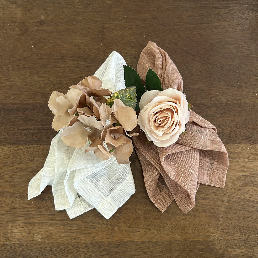 Enrole o guardanapo e insira-o suavemente pela argola de madeira. Ajuste conforme desejar para destacar a flor e valorizar a composição da mesa. Reutilizável e prático, pode ser usado em diversas ocasiões.